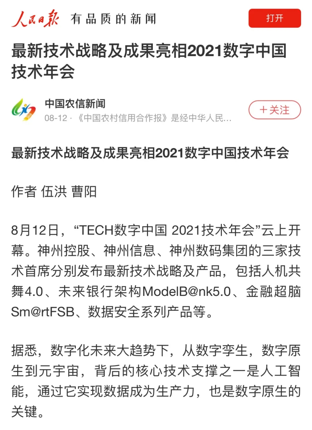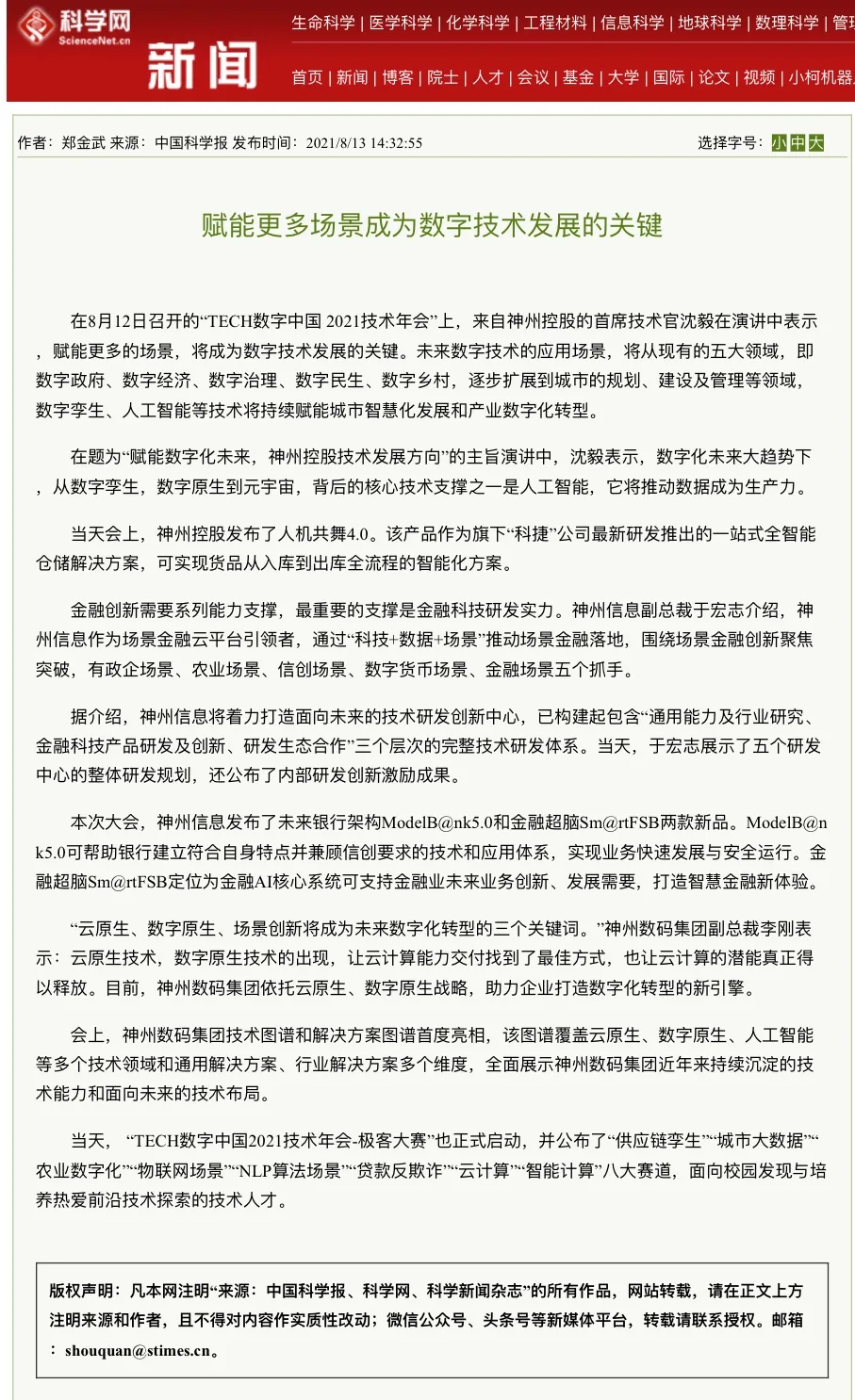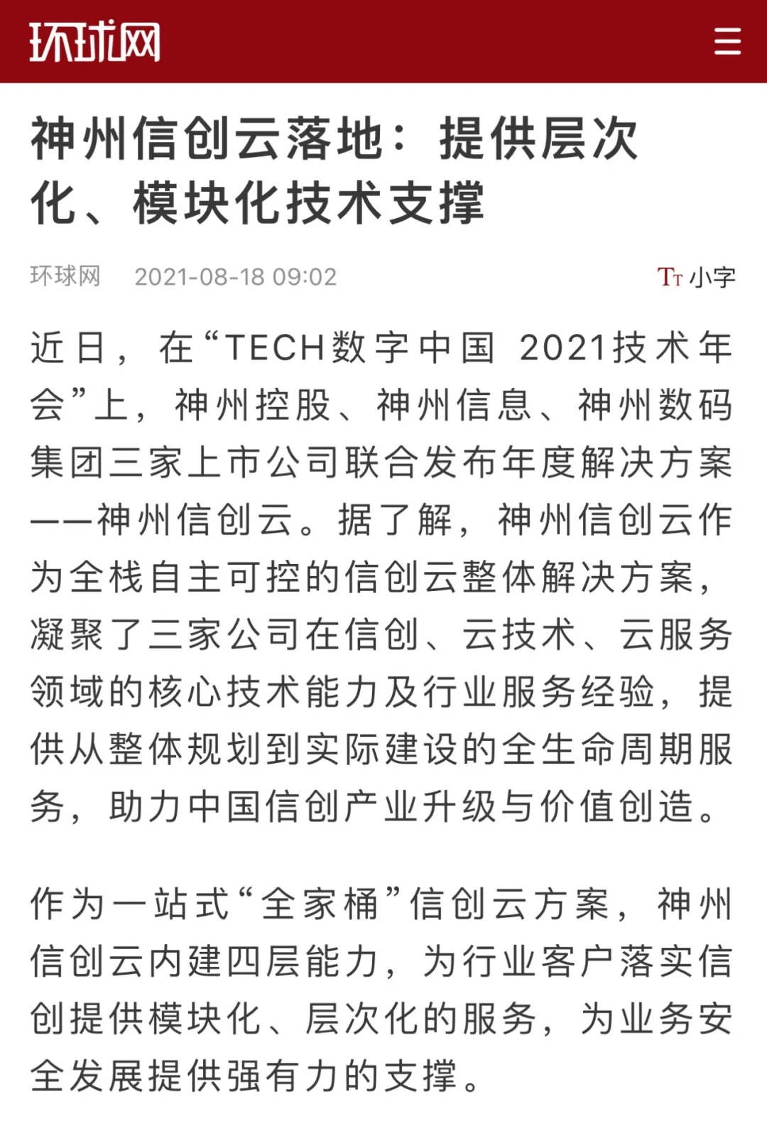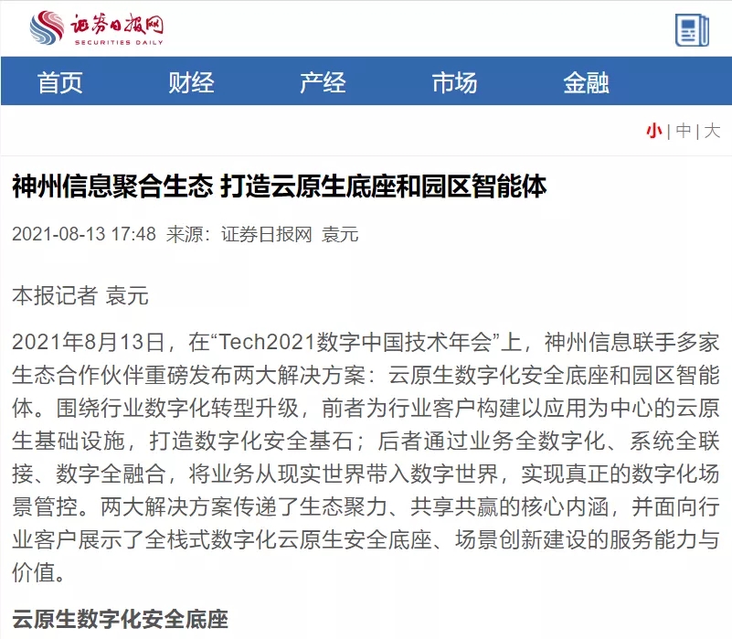 8月12日,由神州控股、神州信息、yabo.com集团联合主办的“科技自强、数据融通、场景创新——TECH数字中国 2021技术年会”云上盛大启幕,发布神州信创云、ModelB@nk5.0、金融超脑Sm@rtFSB、云原生数字化安全底座、园区智能体等重磅产品,国内各大权威、影响力媒体多角度多频次对盛况进行报道!