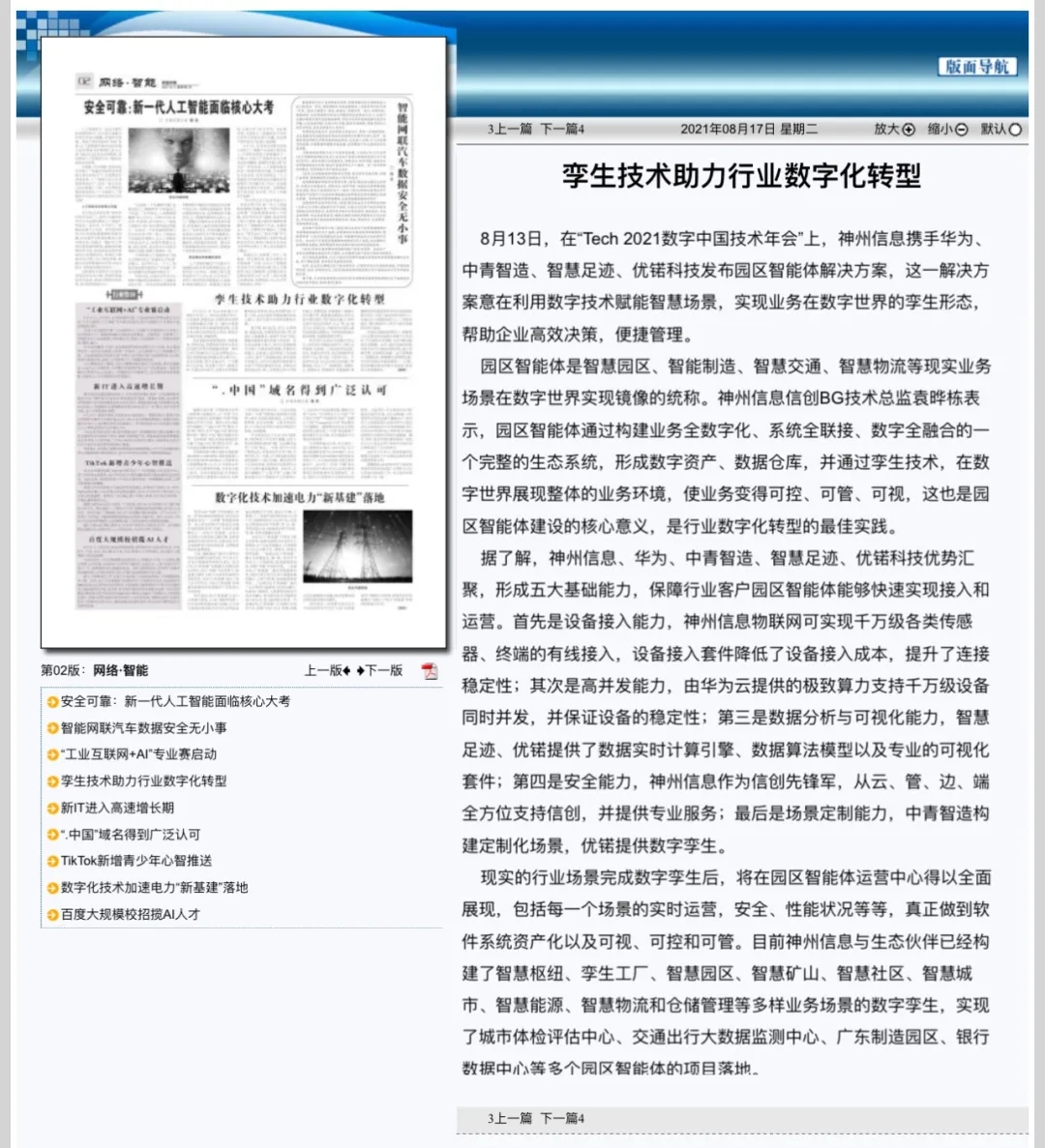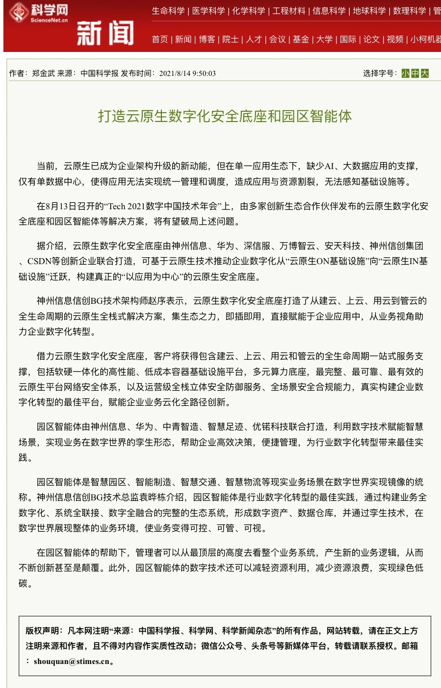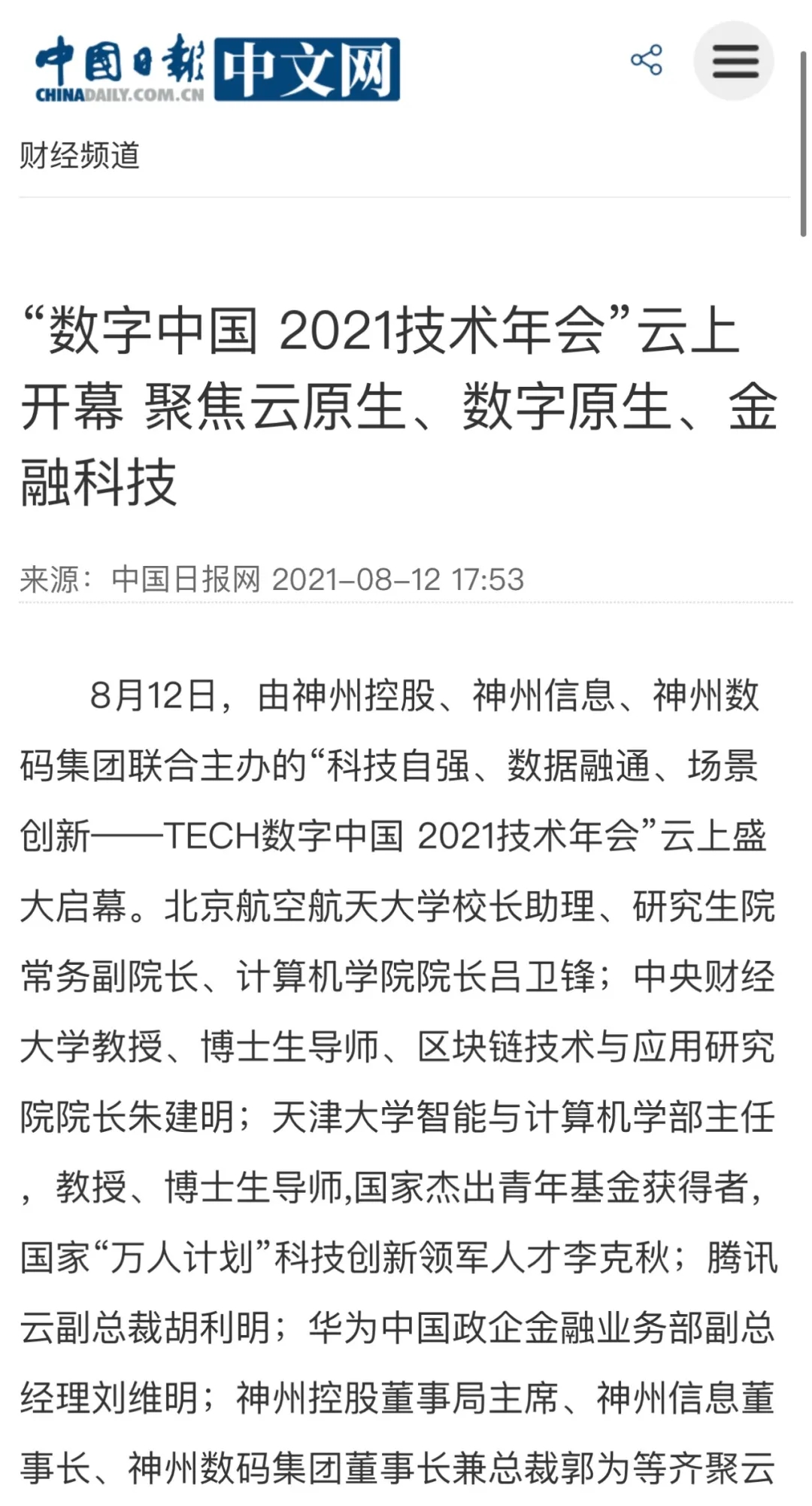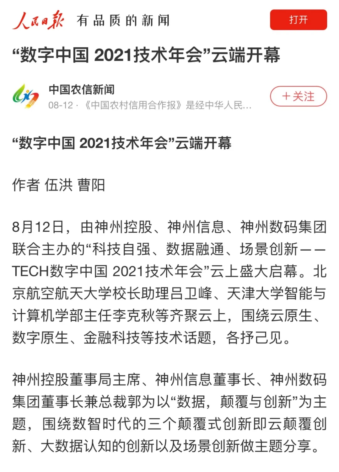 8月12日,由神州控股、神州信息、yabo.com集团联合主办的“科技自强、数据融通、场景创新——TECH数字中国 2021技术年会”云上盛大启幕,发布神州信创云、ModelB@nk5.0、金融超脑Sm@rtFSB、云原生数字化安全底座、园区智能体等重磅产品,国内各大权威、影响力媒体多角度多频次对盛况进行报道!